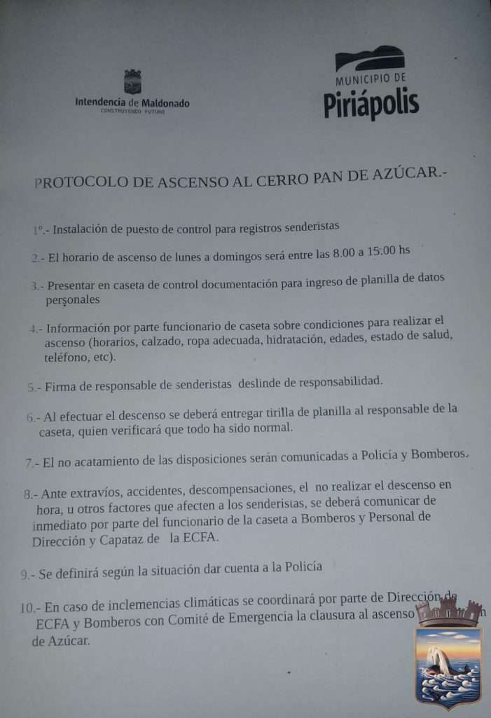 A continuación ofrecemos la información sobre el protocolo de ascenso y descenso del Cerro Pan de Azúcar válido para la Temporada 2019, sujeto a cambios posteriores realizados por la Intendencia de Maldonado por motivos que se entiendan válidos