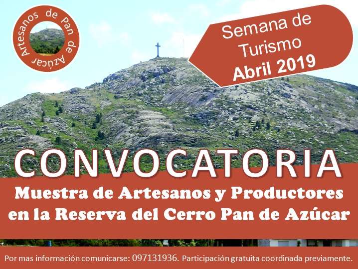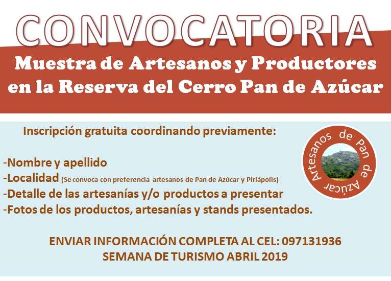 Actores de la sociedad civil convocan artesanos de Pan de Azúcar y Piriápolis interesados en participar de una Muestra que se llevará adelante durante la próxima semana de turismo 2019 en la Reserva de Fauna del Cerro Pan de Azúcar.