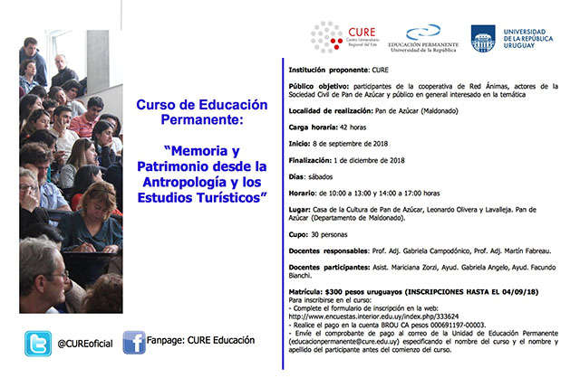 En el mes de setiembre se realizará en la Casa de la Cultura de Pan de Azúcar el curso de Educación Permanente del Centro Universitario Regional del Este (CURE): “Memoria y Patrimonio desde la Antropología y los Estudios Turísticos”