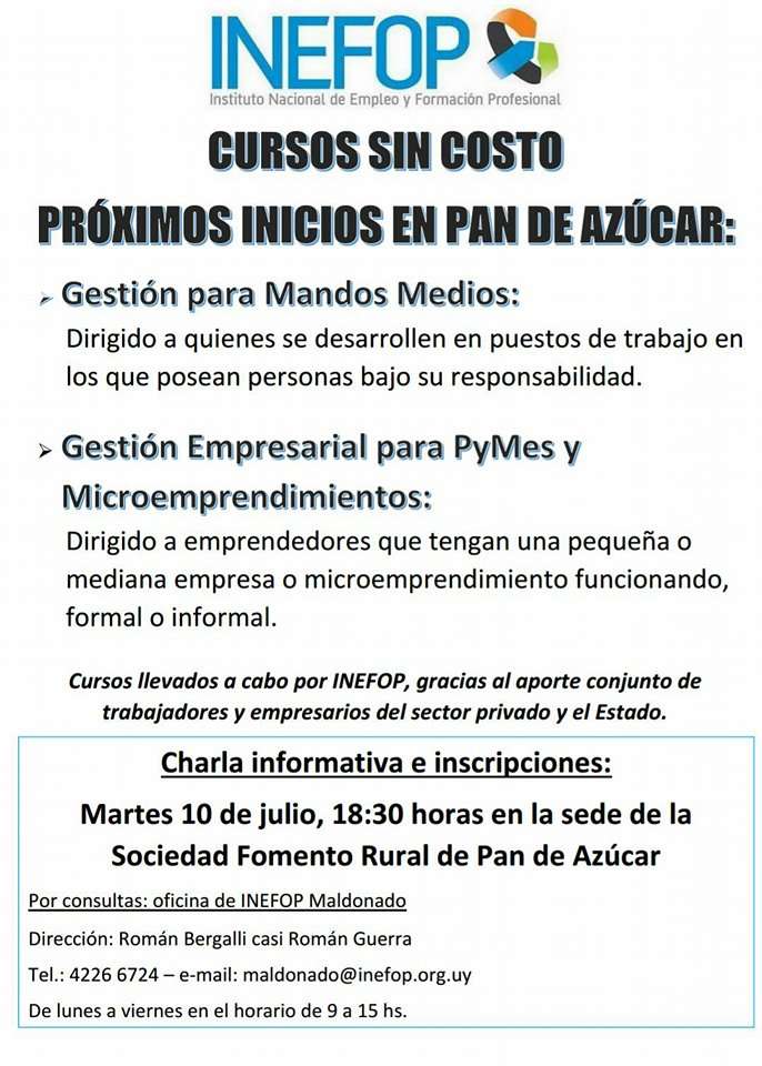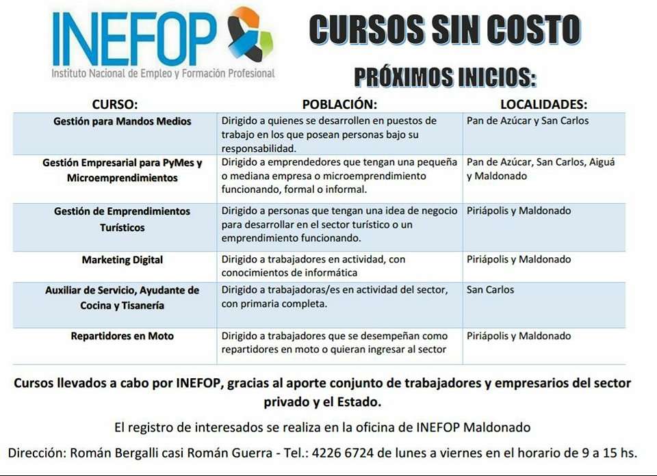 El Instituto Nacional de Empleo y Formación Profesional – INEFOP – dictará en Pan de Azúcar y otros Municipios de Maldonado cursos de capacitación en diversas áreas de interés.