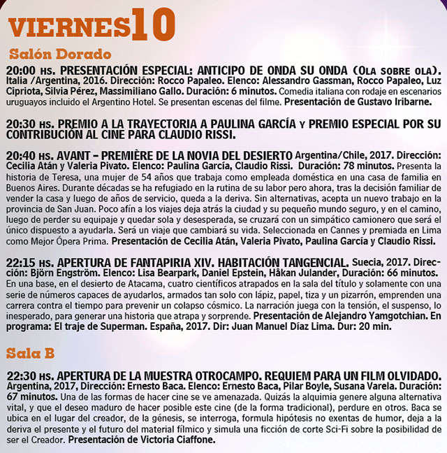 La ceremonia de apertura será el viernes 10, a la hora 19:00, y a la hora 20:00 se pondrá en marcha la muestra audiovisual que abrirá con la avant-première de la producción La novia del desierto, realización argentino-chilena de Cecilia Atán y Valeria Pivato, que cuenta con labor protagónica de Paulina García (Cachimba, Gloria, Las analfabetas), destacada actriz chilena a quien el festival distinguirá con un Premio a la Trayectoria.