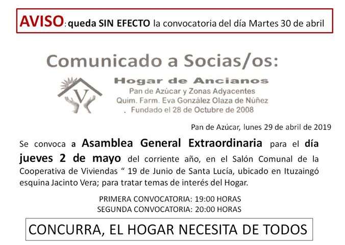 El Hogar de Ancianos “Química Farmacéutica Eva González Olaza de Núñez” de Pan de Azúcar y zona adyacentes, NOS INFORMA EN EL DÍA DE HOY, QUE QUEDA SIN EFECTO LA CONVOCATORIA PARA HOY 30 DE ABRIL donde se elegiría la nueva Comisión Directiva para el nuevo período.
